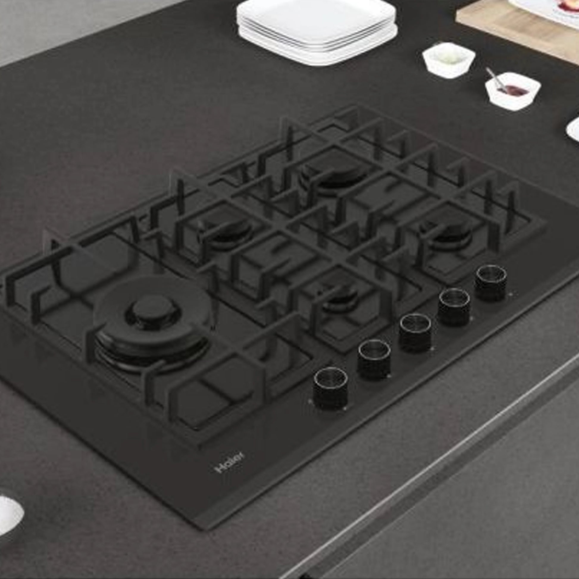 Haier Plaque Gaz 75 cm – 5 brûleurs (dont double couronne), verre trempé, commandes frontales – HAVG7WL5WS6B/1